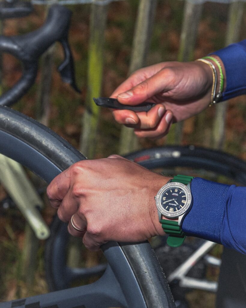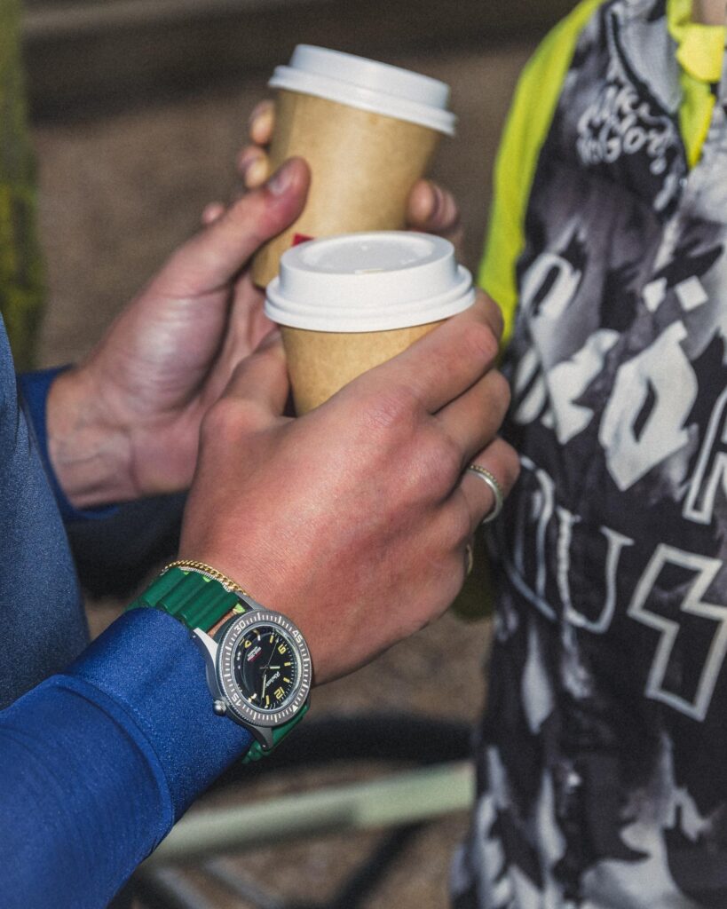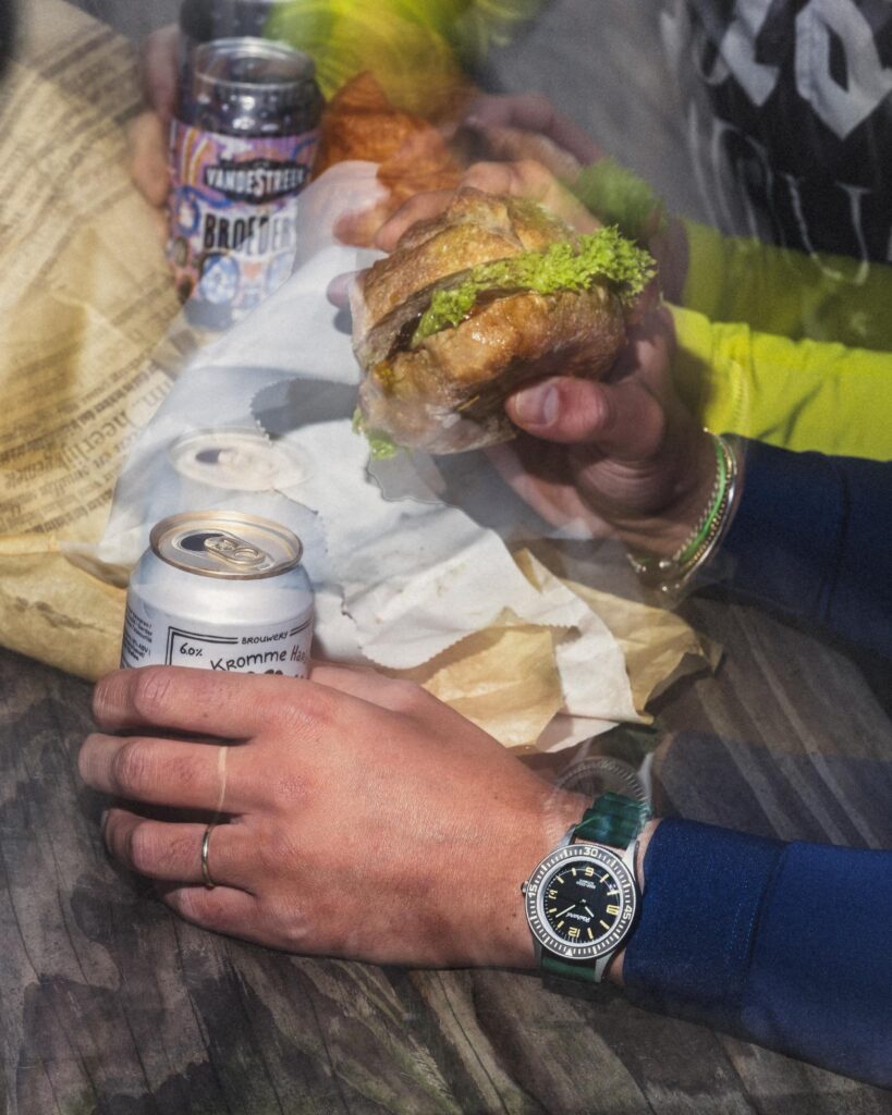 Voor de fotografie werkte ik samen met Evgeny Pakhol. Evgeny fietst mee met de club en kent de omgeving waarin dit horloge gedragen wordt. De beelden laten het horloge zien zoals het bedoeld is. Geen verzamelobject, maar gemaakt om te dragen: onderweg, bij stops, tijdens koffie en momenten tussendoor. Niet als product, maar als onderdeel van de dag.